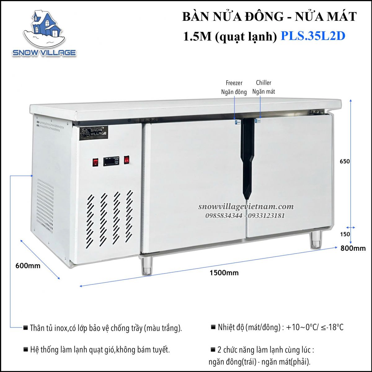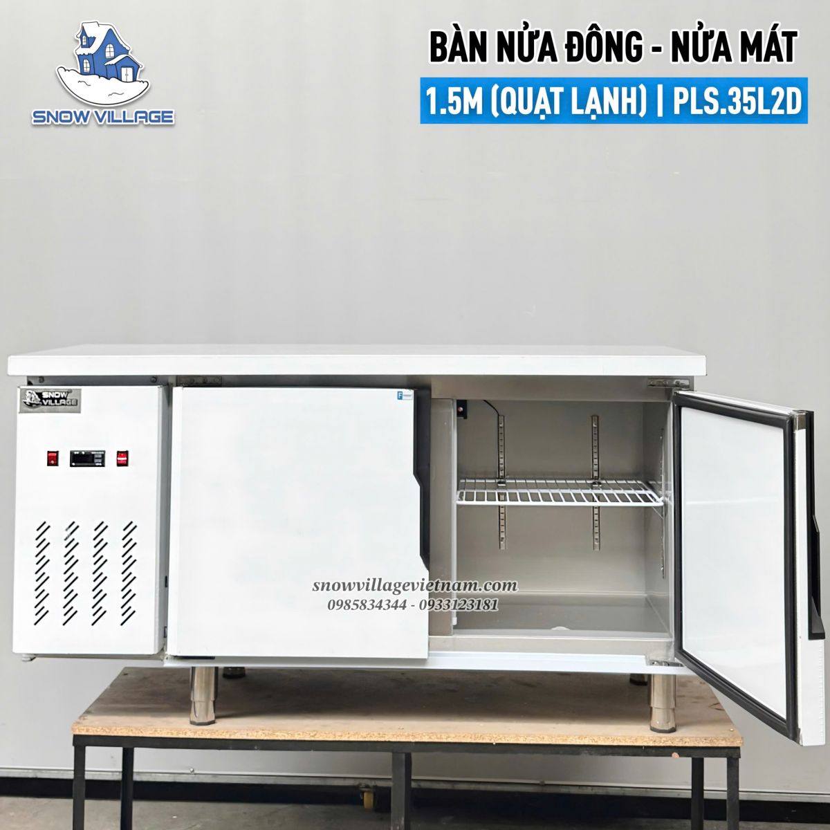 BÀN NỬA ĐÔNG - NỬA MÁT 1M5 PLS.35L2D của Snow Village là thiết bị 2 trong 1 – vừa bảo quản được cả thực phẩm đông và mát, vừa có mặt bàn inox chắc chắn để sơ chế hoặc đặt máy móc, giúp tiết kiệm không gian và chi phí tối đa.
