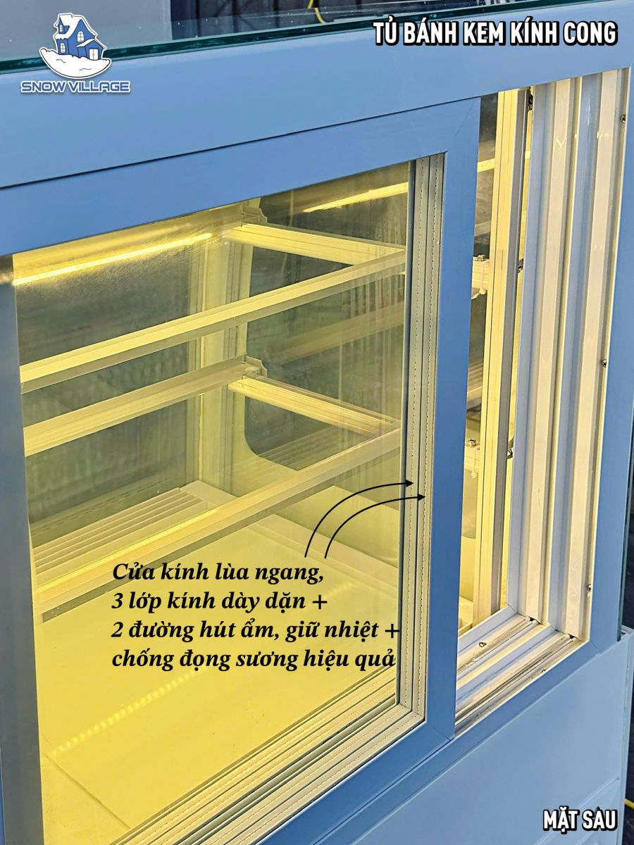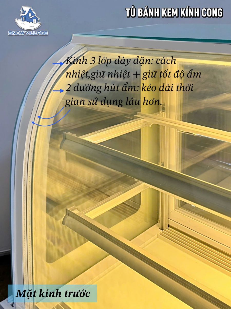 Tủ trang bị kính 3 lớp dày dặn, có độ bền cao và giữ nhiệt cực tốt, hạn chế tối đa thất thoát nhiệt. Có hệ thống sưởi 1 mặt kính trưng bày giúp chống đọng sương, đảm bảo mặt kính luôn trong veo, hiển thị bánh sắc nét và hấp dẫn.