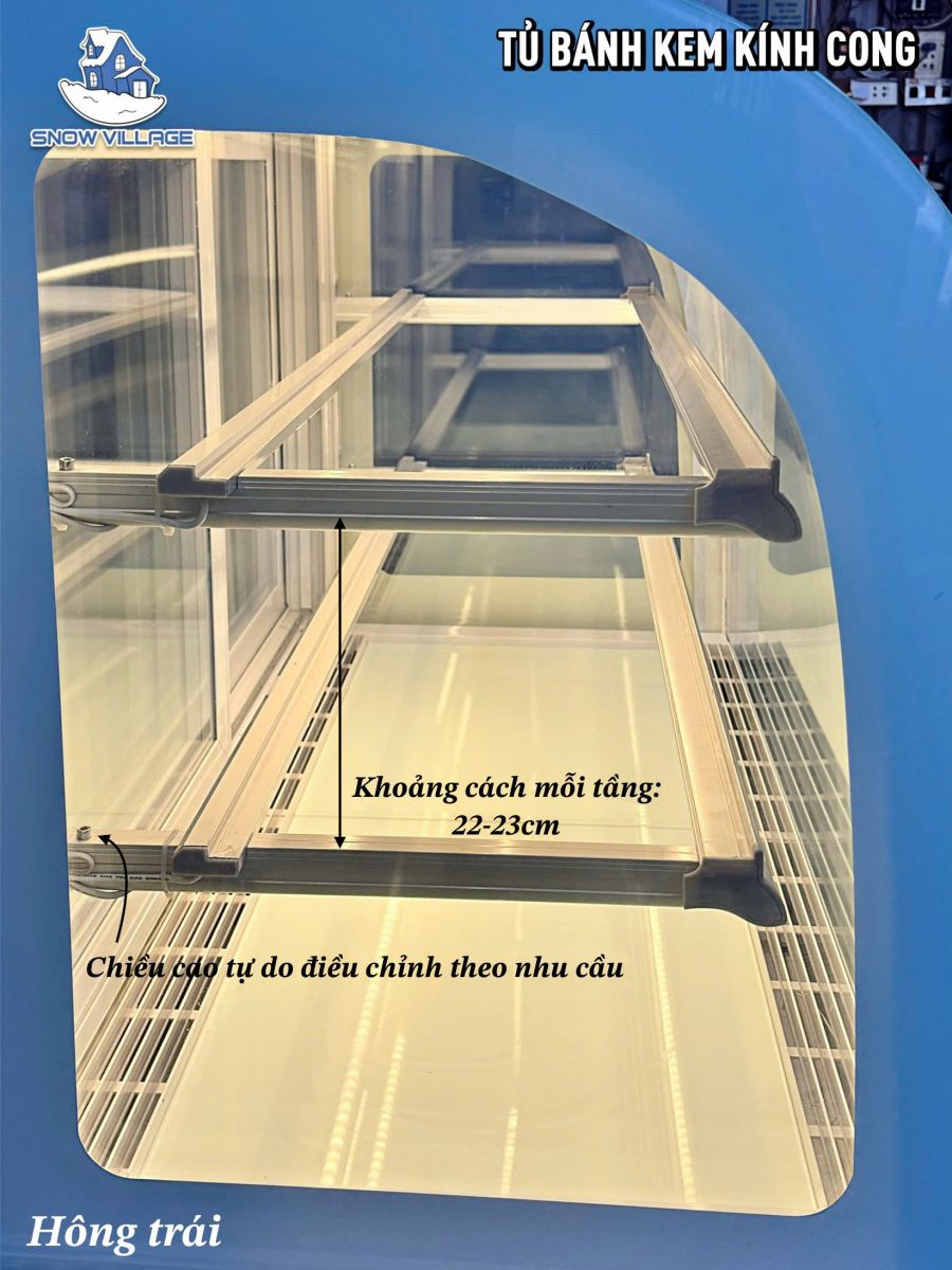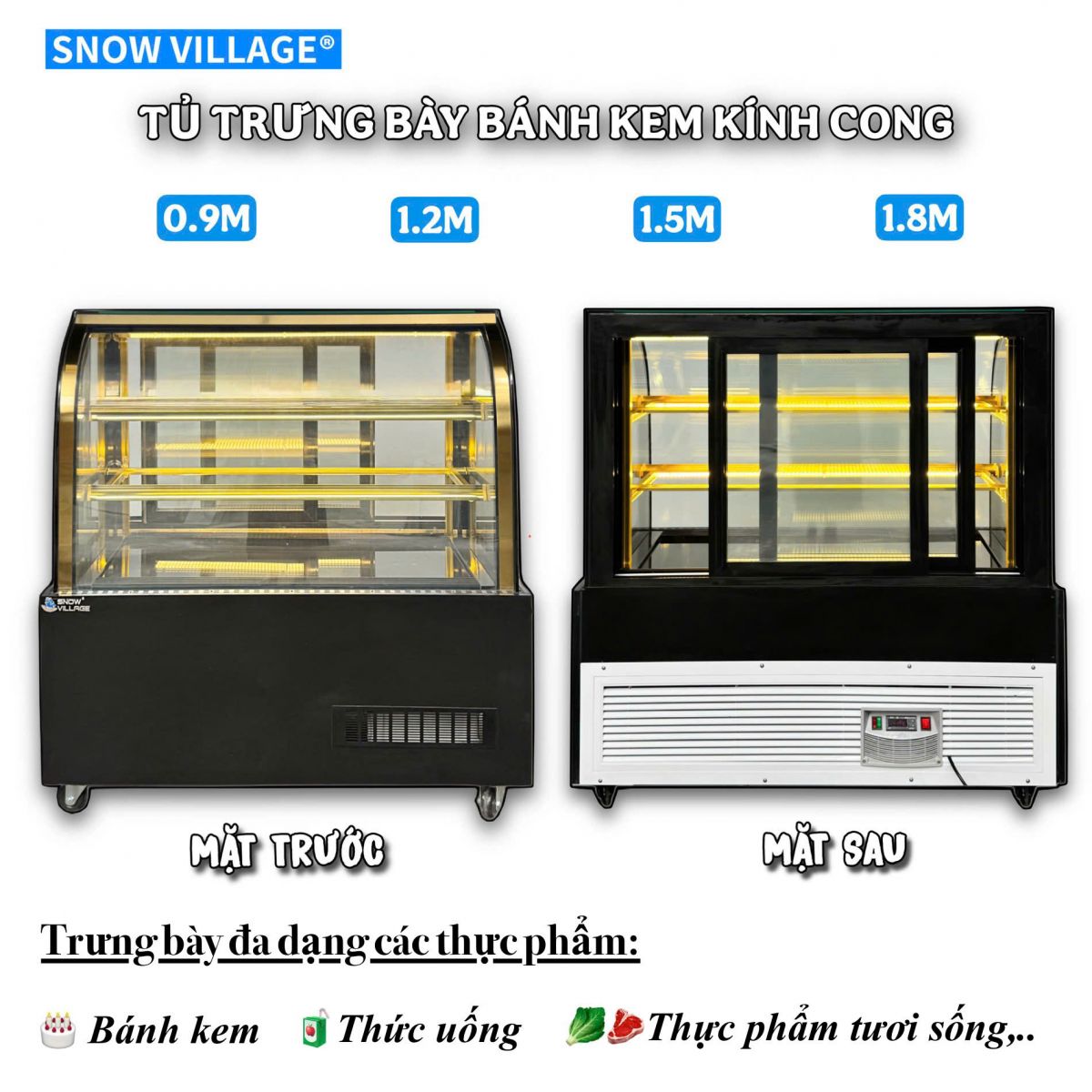 Tủ sử dụng kính vòm cong hiện đại giúp mở rộng góc nhìn, tạo cảm giác sang trọng và hấp dẫn cho bánh kem, bánh mousse, bánh ngọt hoặc thực phẩm trưng bày.