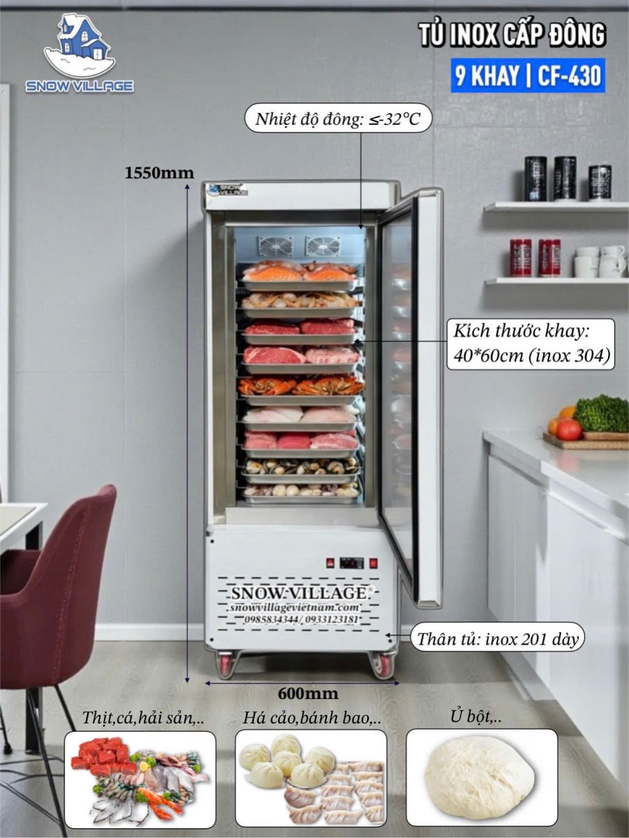 Tủ Inox Cấp Đông 9 Khay CF-430 Snow Village không chỉ là thiết bị cấp đông, mà còn là trợ thủ đắc lực giúp nâng tầm chất lượng món ăn và hiệu suất vận hành bếp.