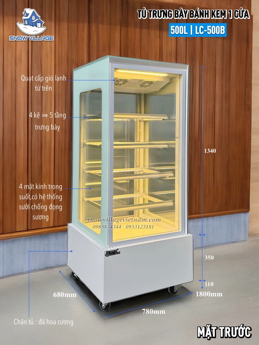 Model : LC-500B . Dung tích chứa rộng rãi nên có thể bảo quản và trưng bày được rất nhiều thực phẩm. Thích hợp mọi không gian, với những không gian có diện tích hẹp, cần trưng bày lượng lớn thực phẩm, thì với dòng tủ trưng bày 4 mặt kính này vô cùng tiện lợi và ứng dụng cao với rất nhiều loại thực phẩm. Ưu điểm vượt trội là có hệ thống sưởi kính giúp mặt kính trưng bày luôn trong suốt khi đặt tủ môi trường bên ngoài, phù hợp với môi trường tại Việt Nam.