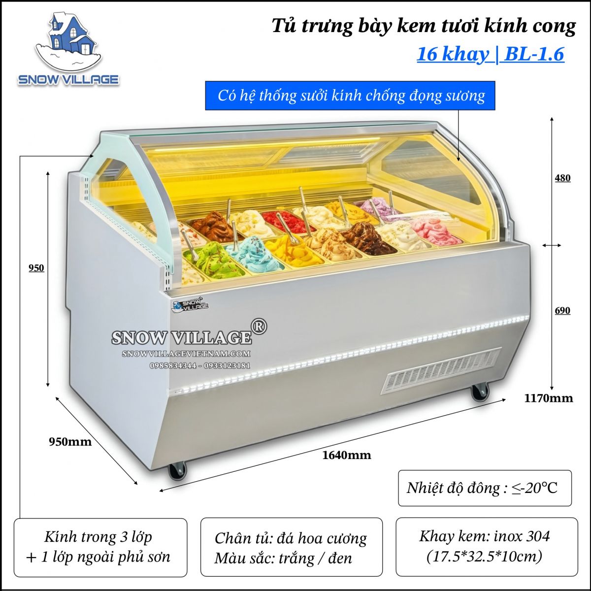 Tủ trưng bày kem 16 khay kính cong thương hiệu Snow Village®